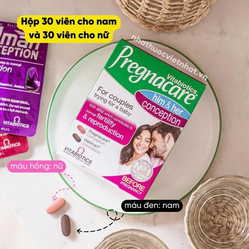 Thực phẩm chức năng Pregnacare được bào chế thành 2 loại viên uống trong mỗi hộp. Trong đó, viên màu tím cho nam và viên màu hồng cho nữ.