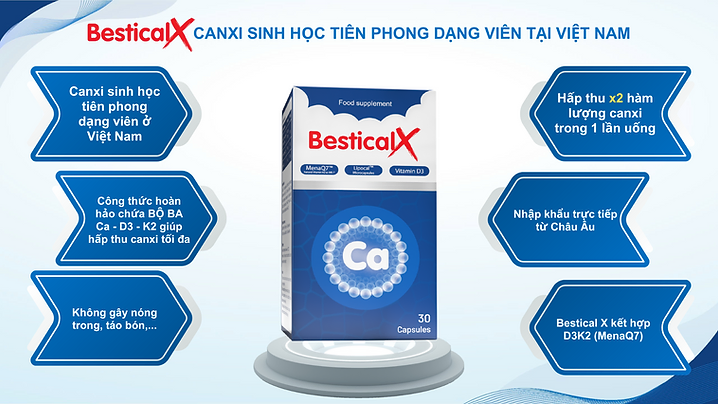 Bestical là sản phẩm canxi sinh học đầu tiên tại Việt Nam được sản xuất tại Slovenia, với công nghệ tiên tiến Lipocal™ làm nhỏ mịn canxi rồi bao bọc trong lớp Lecithin đậu nành có cấu trúc tương đồng và dễ dàng chui qua màng lipid tế bào. Ưu điểm của canxi sinh học trong Bestical là giúp trẻ vừa dễ hấp thu, vừa nhận được lượng lớn canxi x2 trong 1 lần uống.
