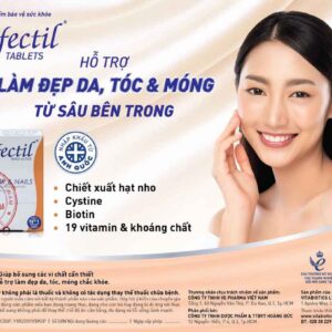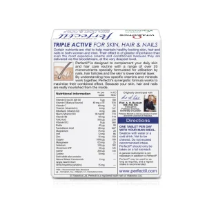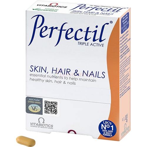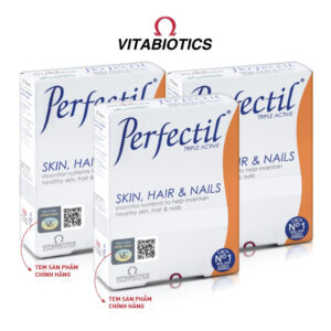 - Công thức toàn diện cho da, tóc và móng: Perfectil kết hợp 22 vi chất dinh dưỡng thiết yếu như biotin, kẽm, và selenium, được thiết kế đặc biệt để nuôi dưỡng từ bên trong, hỗ trợ làn da khỏe mạnh, tóc bóng mượt và móng chắc khỏe.