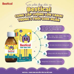 Bestical được thiết kế dạng dung dịch, dễ dàng hòa quyện với thức ăn hoặc nước uống, giúp trẻ em dễ dàng tiếp thu và hấp thụ. Hương vị của Bestical cũng dễ chịu, không gây cảm giác khó chịu cho trẻ, nhờ vậy mà việc uống hàng ngày trở nên dễ dàng và thú vị hơn cho bé.