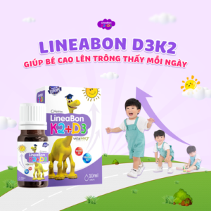 Tuy nhiên 2 loại vitamin này lại có rất ít trong thức ăn, trẻ nhỏ cần bổ sung dự phòng ngay từ sau khi sinh đến hết 2 năm đầu đời. LineaBon K2+D3 là sản phẩm mang lại hiệu quả cao trong việc thúc đẩy chiều cao của trẻ nhỏ và trẻ sơ sinh. LineaBon K2+D3 đạt tiêu chuẩn sản xuất cao nhất hiện nay GMP – FDA Hoa Kỳ, không màu, không mùi và dễ uống.